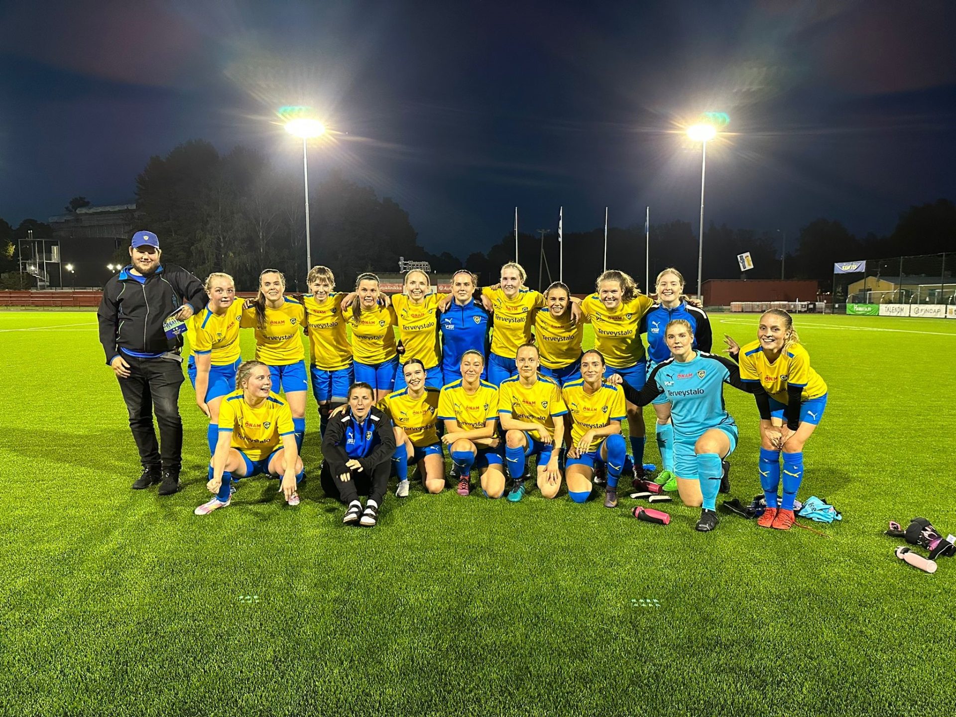 Keltapaitojen maalihanat aukesivat ryöpyllä ottelun vanhettua reilut 20 minuuttia. Vera Saastamoisen illan ensimmäinen osuma oli jälleen jalkapallokarkkia parhaimmillaan, kun vasemmalta laidalta vapautunut Vilma Lanki antoi millintarkan keskityksen, jonka Saastamoinen tuikkasi läheltä maaliin. Saastamoinen osui uudelleen vain seitsemän minuuttia myöhemmin, kun Isabella Lievosen sivuvapari päätyi vastustajan maalivahdin epävarman pelaamisen myötä maalin kulmalle Saastamoiselle, joka sai kunnian tuikata pallon sisään. Hattutemppu täydentyi vain neljä minuuttia tästä kun Saastamoinen vapautettiin rangaistusalueella ja liekeissä ollut kärki tuikkasi pallon varsin pienestä kulmasta ohi Alexandra Starckin.